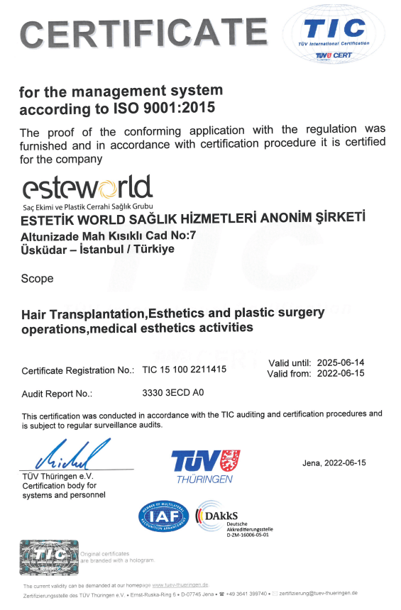 Esteworld Группа Клиник Пластической Хирургии – компания, которая предоставляет медицинские услуги в области эстетической пластической хирургии и хирургии ожирения, опираясь на мультидисциплинарный подход, опыт тщательно подобранного персонала и использование высоких технологий. Группа медицинских клиник имеет 3 филиала в таких районах Стамбула, Bahçelievler (Бахчелиэвлер) и Altunizade (Алтунизадэ) (2). Мы поставили перед собой задачу – стать наиболее востребованной профессиональной клиникой эстетической пластической хирургии, отвечающей национальным и международным стандартам качества, а также предоставляющей медицинские услуги посредством филиалов в Турции и за рубежом. В 2014 году мы получили сертификат ISO 9001-2008, что стало письменным подтверждением качества услуг, которые мы оказываем. Запущенные в 2016 году рабочие проекты выводят компанию на более высокий уровень. Мы продолжаем свою работу над повышением качества и получением аккредитации JCI, налаживаем контакты с партнерами по всему миру (их у нас уже около 100).